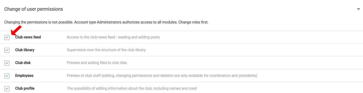 After clicking on permissions, you will be taken to a page where you can see all possible management modules. By checking the next checkboxes you will give the user permissions to the modules. Please note that some of the modules are crucial for the system and the data contained in them, so think carefully about who you give access to the key modules. Removing certain elements in the system is irreversible!