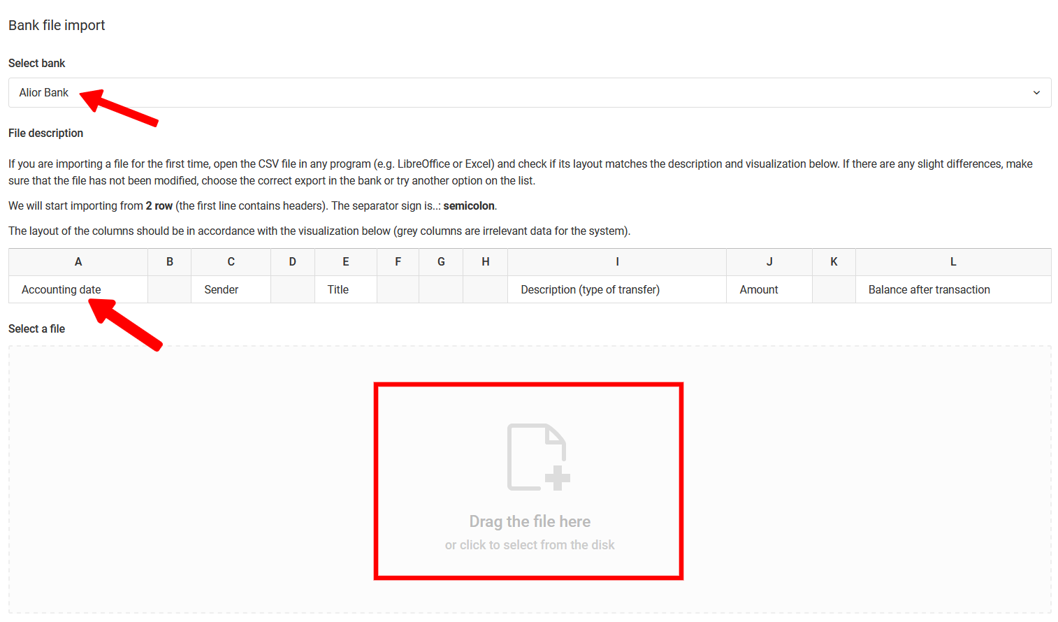 If you have the correct file and if you import it for the first time, open the file in any program (e.g. LibreOffice or Excel) and check if its layout matches the file description and its visualization. If there are any slight differences, make sure that the file has not been modified, choose the correct export in the internet banking system or try another option from the list of banks (for some banks we have more than one parser). Remember that there is no need to remove outgoing transfers, the system will recognize them and ignore them during the file parsing process. If the description and structure of your file match the one displayed in the import window, you will have no choice but to drag the file to the field marked with a red frame. If the file is correct, the system will start parsing the file, which will take you to the generated transaction list.