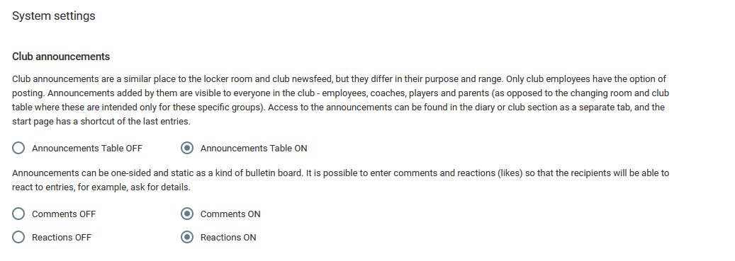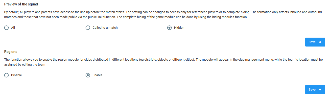 Here you manage the visibility: tabs for announcements, match line-up previews, regions tabs and whether the user will be able to leave reactions and comments under the post on the board and locker room. This is also where you configure automatic DotPay payments, but we have already talked about this in previous chapters.