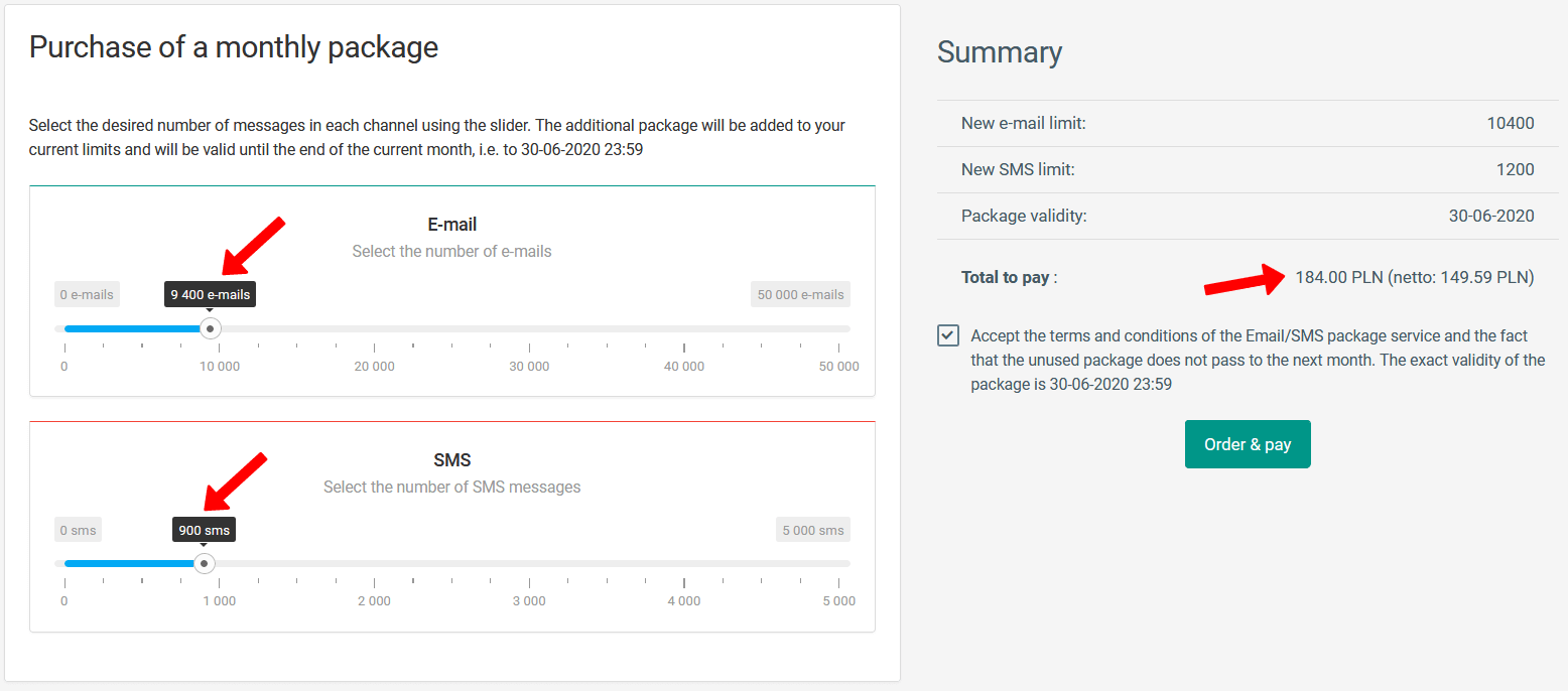 Here you can also check the current statistics of package consumption. To buy an additional package via SMS or email, click on the "buy package" button indicated in the picture. After clicking it, you will be taken to the message package purchase page. Remember that each purchased package is valid until the last day of the month! The unused package is not being transferred to the next month!