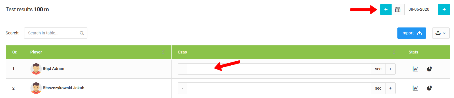 To start completing the results, you need to click on "test list" in the left menu. After clicking you will go to the list of tests. There you will find your tests and some basic tests prepared by us. These will include a 5m run, 20m run, 30m run and beep test. After clicking on a given test you will see a list of players taking part in the test. If there were no tests on the current day, you will see empty fields with space to enter test results. To change the date of the test, click on the date field in the top right corner of the window.