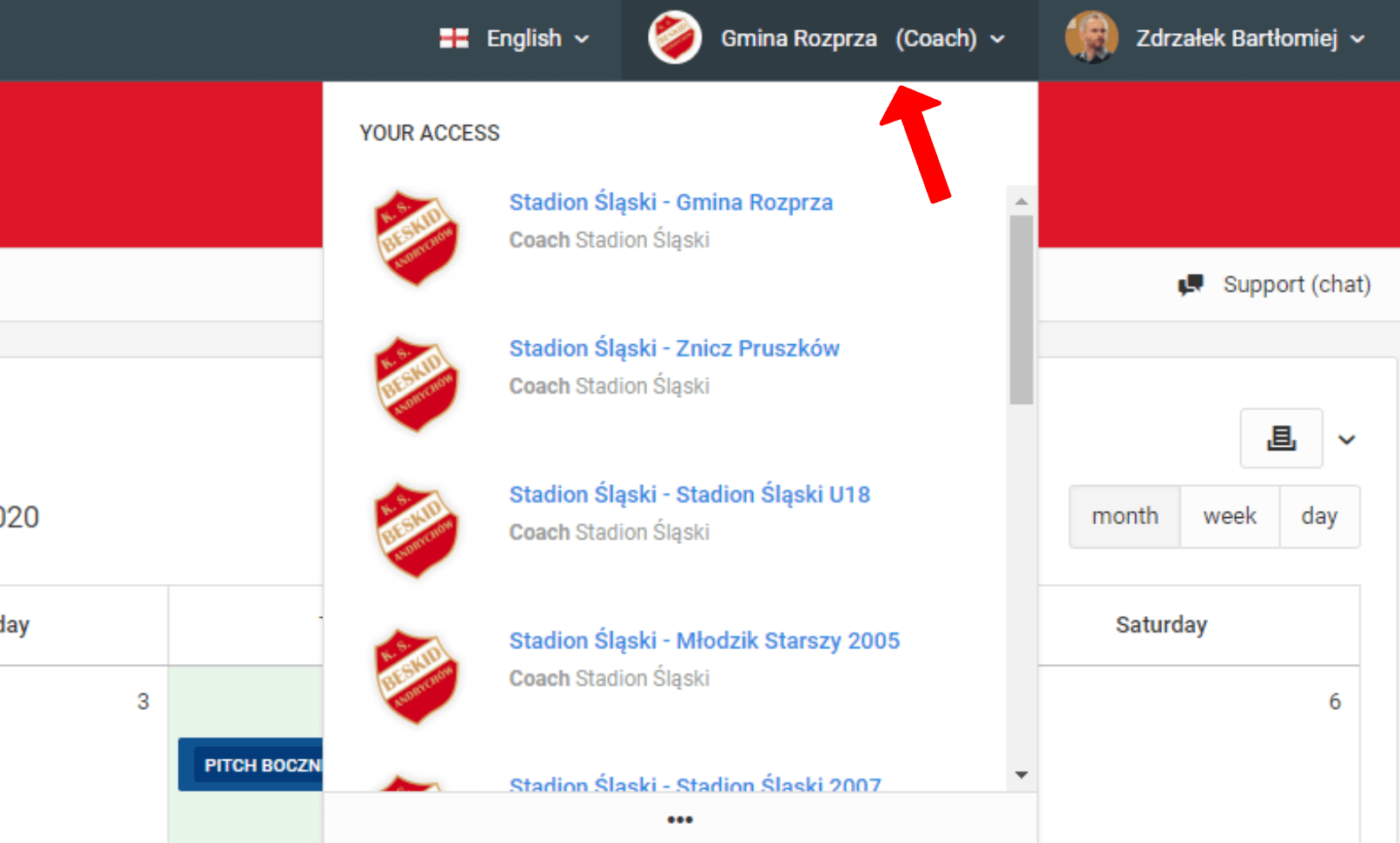 Sustav vam daje mogućnost da imate više od jedne uloge. To znači da s jednom prijavom i lozinkom sustav možete koristiti kao: roditelj, igrač, trener, koordinator ili glavni administrator kluba. Za prebacivanje između uloga kliknite na gumb s trenutno učitanom ulogom u gornjem desnom kutu. Sljedeći korak je odabir uloge koju želite učitati kao aktivnu. Promjena uloge može rezultirati promjenom razine pristupa sustava. Detaljniji popis uloga možete pronaći u lijevom izborniku pod "Pristupi".
