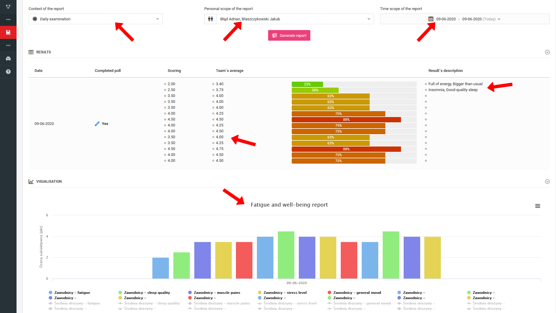 სისტემაში ასევე ხელმისაწვდომია შემაჯამებელი ანგარიში, რომელიც აჩვენებს მონაცემების ძალიან ფართო სპექტრს ანალიზებთან ერთად. ანგარიშის ცხრილის ზემოთ ხელმისაწვდომია კონფიგურატორი. დეტალური ანგარიშების მსგავსად, შეგიძლიათ აირჩიოთ, თუ რა ტიპის კვლევები უნდა გამოჩნდეს ცხრილში. შეგიძლიათ აირჩიოთ, რომელი მოთამაშეები უნდა შევიდნენ ანგარიშში, მონიშნოთ ანგარიშის დროის დიაპაზონი და ასევე დამალოთ დღეები გაზომვების გარეშე. ცხრილის ზემოთ მარჯვენა მხარეს გაქვთ ორი სლაიდერი, რომლებიც გავლენას ახდენს მონაცემების წარდგენის წესზე. პირველი პასუხისმგებელია შედეგების გამოთვლის წესის შეცვლაზე - შეგიძლიათ აირჩიოთ რიცხობრივი ან პროცენტული მნიშვნელობა. მეორე სლაიდერში განსაზღვრავთ, მონაცემები უნდა წარმოდგენილი იყოს როგორც სკალის მნიშვნელობა თუ როგორც გამოთვლილი დაღლილობის ერთეულები (AU). გახსოვდეთ, რომ უნდა დაადასტუროთ ანგარიშის კონფიგურაციისა და ანალიზის ყოველი ცვლილება ვარდისფერი ღილაკით "ანგარიშის გენერირება". თავად ცხრილი შეიცავს რამდენიმე ტიპის მონაცემს. სვეტებში, სადაც თარიღებია სათაურებში, გაქვთ მონაცემები კონკრეტული შედეგების შესახებ, რომლებიც მოთამაშემ შეიყვანა. სვეტები შეიძლება ეხებოდეს ყოველდღიურ, ვარჯიშის შემდგომ და მატჩის შემდგომ ტესტებს. უფრო მუქი სქელი ხაზის უკან მდებარე სვეტები ეხება მოთამაშეების ჯამურ, საშუალო და დაღლილობის ერთეულებს (AU) არჩეული დროის პერიოდის განმავლობაში. უფრო მუქი-სქელი ხაზის ქვემოთ მდებარე ხაზებში გვაქვს თითოეული ტესტის შედეგების შეჯამება მთელი გუნდისთვის. ცხრილში გამოყენებული ფერები შეესაბამება ფერებს, რომლებიც მოთამაშეებმა უნდა აირჩიონ გამოკითხვის შევსებისას. მწვანე - მსუბუქი დაღლილობა, მუქი წითელი - მაქსიმალური დაღლილობა.