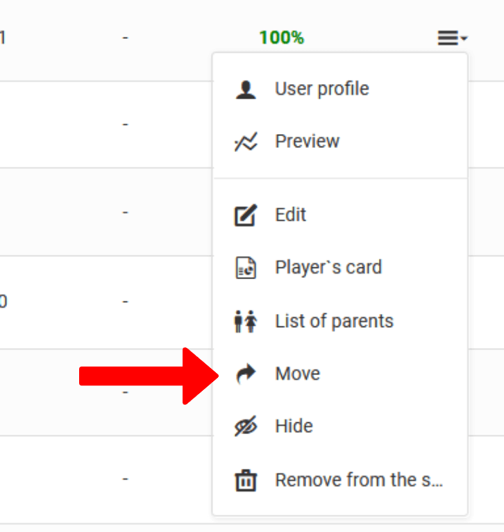 Система дает возможность копировать / перемещать игроков между командами в рамках одной субъекта. При копировании игрока у нас есть возможность скопировать или переместить игрока. Для этого выберите опцию «Переместить» из списка игроков в меню игрока.