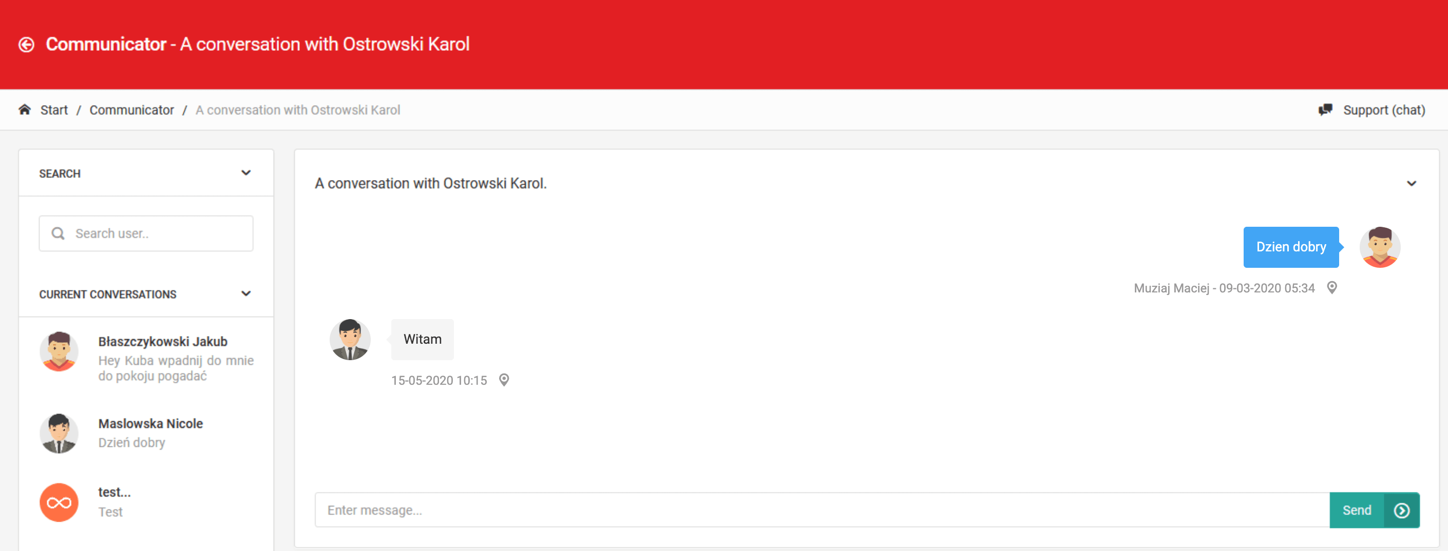 Tako na stopnji mobilne aplikacije kot na stopnji internetnega iskalnika je na voljo messenger, ki omogoča komunikacijo med uporabniki sistema. Na voljo sta dva načina pogovora - zasebni (1 na 1) in skupinski pogovor pri katerem lahko sodeluje več uporabnikov.