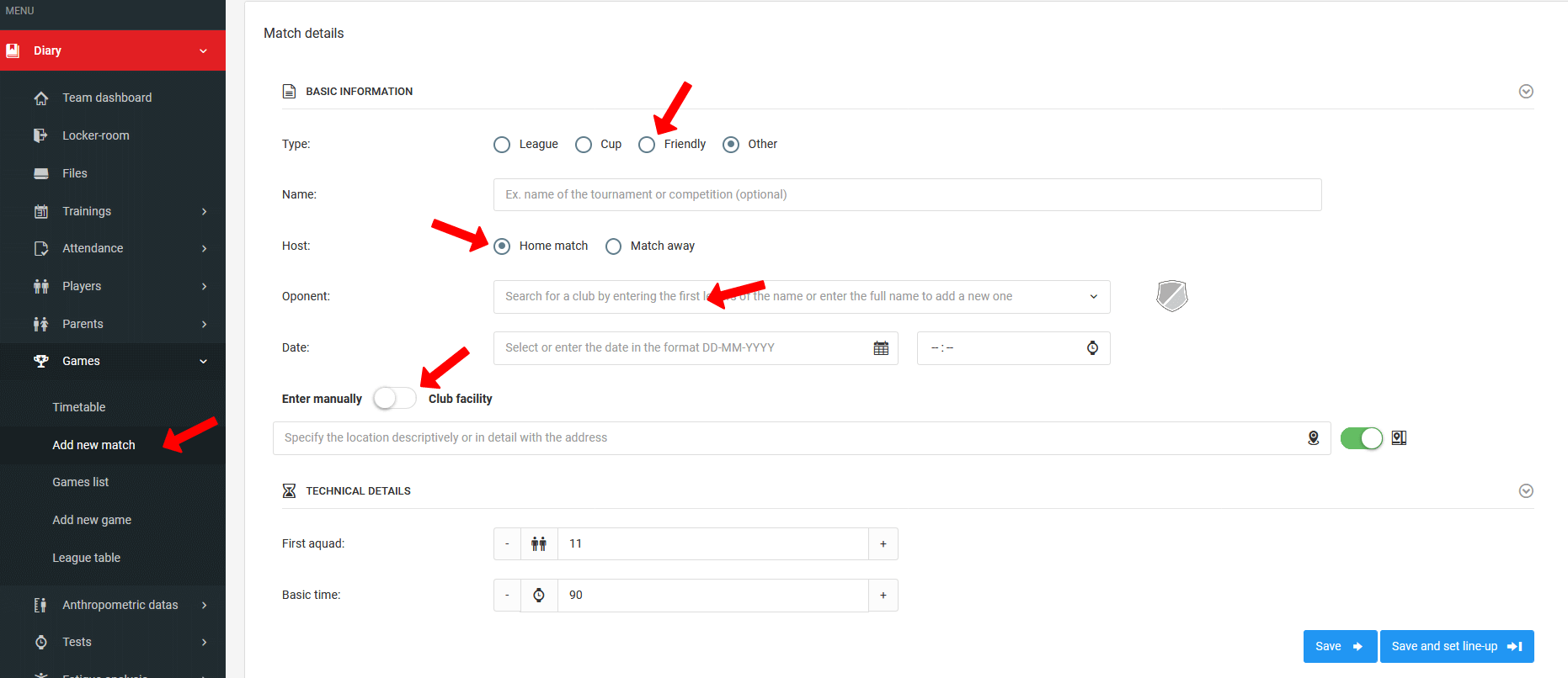 Da dodate eno tekmo na vaš urnik, kliknite na levi meni dnevnik igre dodaj novo tekmo. Po kliku na to povezavo boste preusmerjeni na okno za ustvarjanje tekem. Izpolnite nekaj polj, ki se bodo prikazala na obrazcu. Zapomnite si, da določite vrsto tekme, nasprotnika, datum, čas in kraj. Kar zadeva lokacijo, jo lahko vnesete ročno ali uporabite prej določene objekte, ki so vneseni z računom administratorja. Po tem ko ste izpolnili vsa polja, shranite obrazec in nadaljujte s določitvijo postave za tekmo.